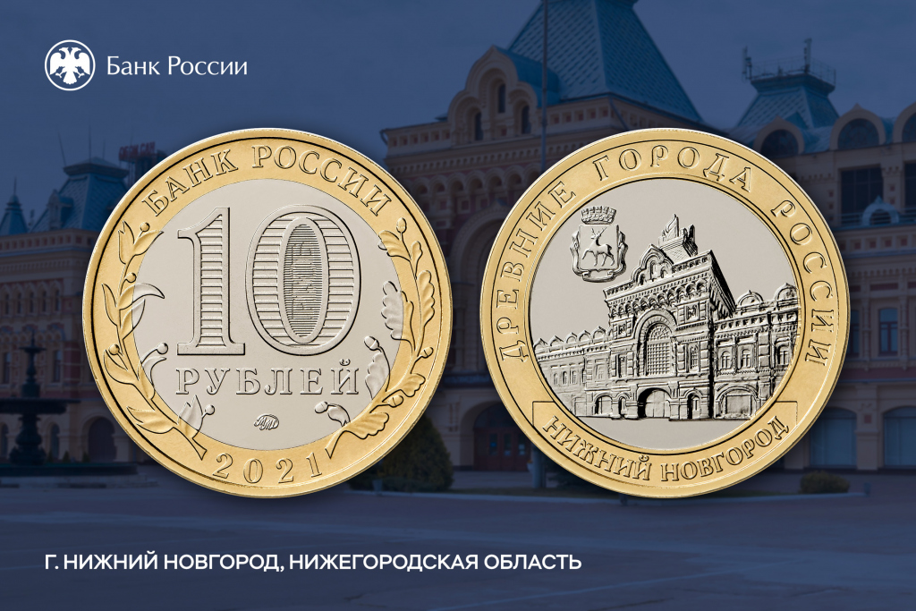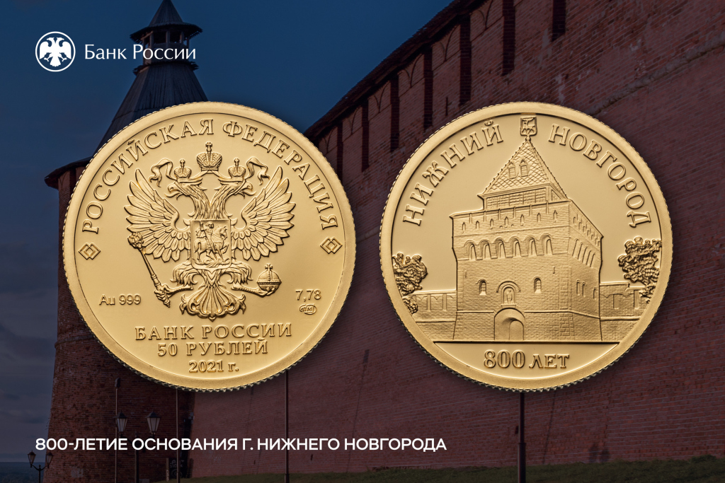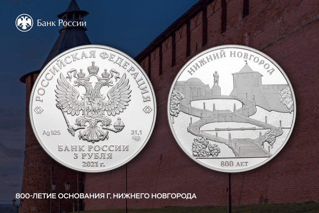 К юбилею столицы Приволжья Банк России 28 мая 2021 года выпускает в обращение памятные монеты: серебряную номиналом 3 рубля (тираж — 3 тыс. штук) и золотую номиналом 50 рублей (тираж – 1 тыс. штук) «800-летие основания г. Нижнего Новгорода» серии «Города» и монету из недрагоценного металла номиналом 10 рублей «г. Нижний Новгород, Нижегородская область» серии «Древние города России» (тираж - 1 млн штук).