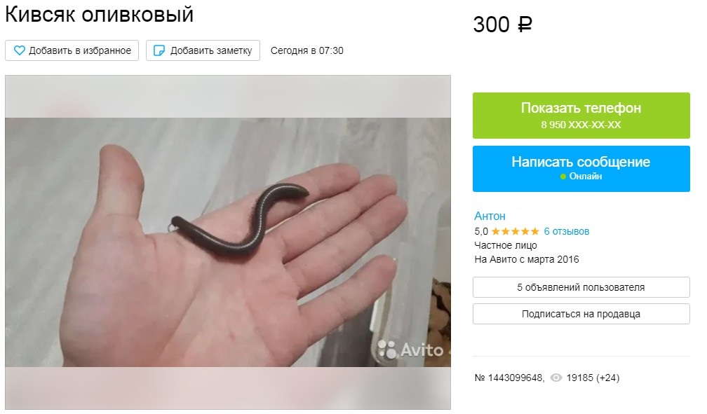 Для тех, кто хочет завести кого-то подешевле и попроще, на “Авито” Нижнего Новгорода предлагают приобрести тихого и спокойного оливкового кивсяка. Эта многоножка вырастает в длину до 30 см и имеет огромное количество ножек. Однако передвигается она вполне беззвучно, что не помешает спокойному сну владельца. Питается кивсяк преимущественно картофелем, поэтому проблем в кормежке такого зверя не будет.