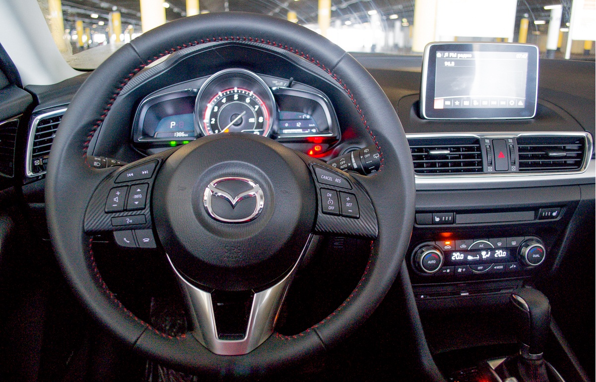 В салоне «Мазды» не пропадает впечатление автомобиля близкого к моделям немецкой премиальной тройки. К качеству отделочных материалов придраться невозможно. Строгий черный интерьер в меру разбавлен вставками под алюминий и черный глянец. Над панелью установлен монитор мультимедийной системы, который по началу вызывает удивление и желание спрятать его при выходе из машины. При взгляде с улицы его вполне можно принять за оставленный по забывчивости навигатор. Управлять функциями на нем, можно как тыкая пальцев в экран, так и с помощью джойстика на центральном тоннеле. Из найденных недостатков бросается в глаза отсутствие доводчиков у пассажирских стеклоподъемников и невозможность регулировки подлокотника.